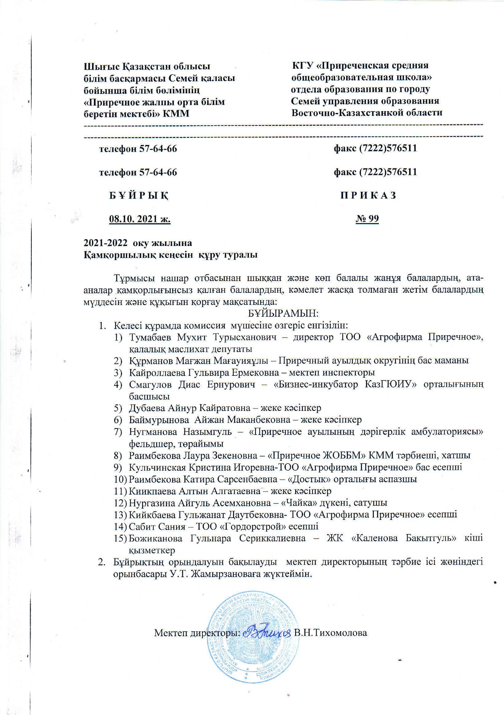 Қамқоршылық кеңесін құру туралы » Приреченская средняя общеобразовательная школа