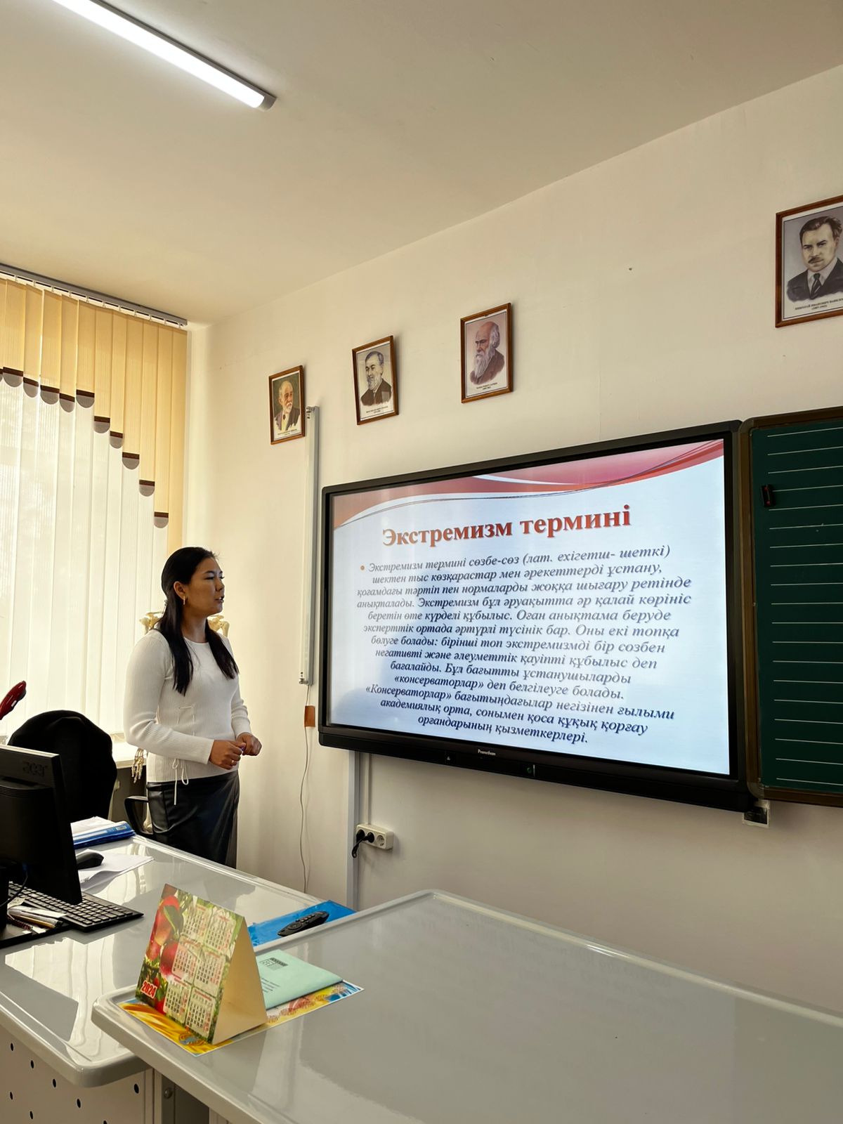 9 “А” сыныбында «Дін. Терроризм, Экстремизм» тақырыбында сынып сағаты өткізілді. Іс-шара барысында оқушыларға экстремизм мен терроризмнің қоғамға тигізетін зияны, діннің дұрыс түсінігі туралы маңызды ақпараттар берілді. Сынып жетекшісі Қожахметова Г.Б. оқушылармен бірге осы тақырыпты талқылап, олардың пікірлерін тыңдады. Қауіпті идеялардан сақ болу және дұрыс ақпаратты ажырату жолдарына ерекше назар аударылды.
