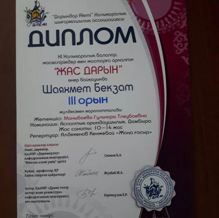 2022 жылдың 6-шы наурызында Астана қаласында ХI Халықаралық балалар және жасөспірімдер мен жастарға арналған "Жас Дарын" өнер байқауында ШҚО Семей қаласының Приречное ЖОББМ 6"А" сынып оқушысы Шаяхмет Бекзат II және III орын жүлдесімен марапатталды.Номинациясы : Аспаптық орындаушылық домбыра.Репертуарында "Жаңа ғасыр" және "Балбырауын"күйлері.