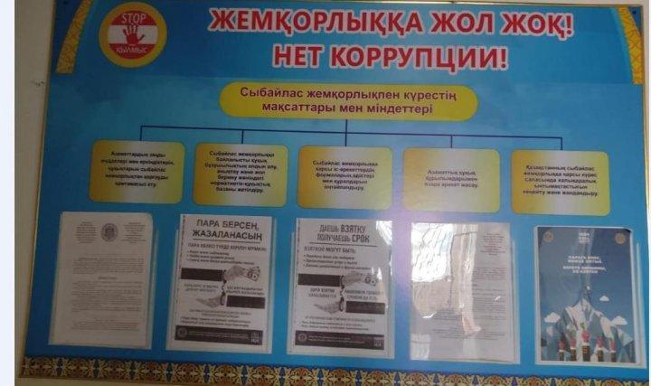 Проведен цикл классных часов на тему: «Страна без коррупции – процветающая страна», тренинг для учащихся 9-11 классов на тему: «В чем важность честности». Среди учащихся 5-9 классов конкурс плакатов на тему: «Адал жол-честный путь».