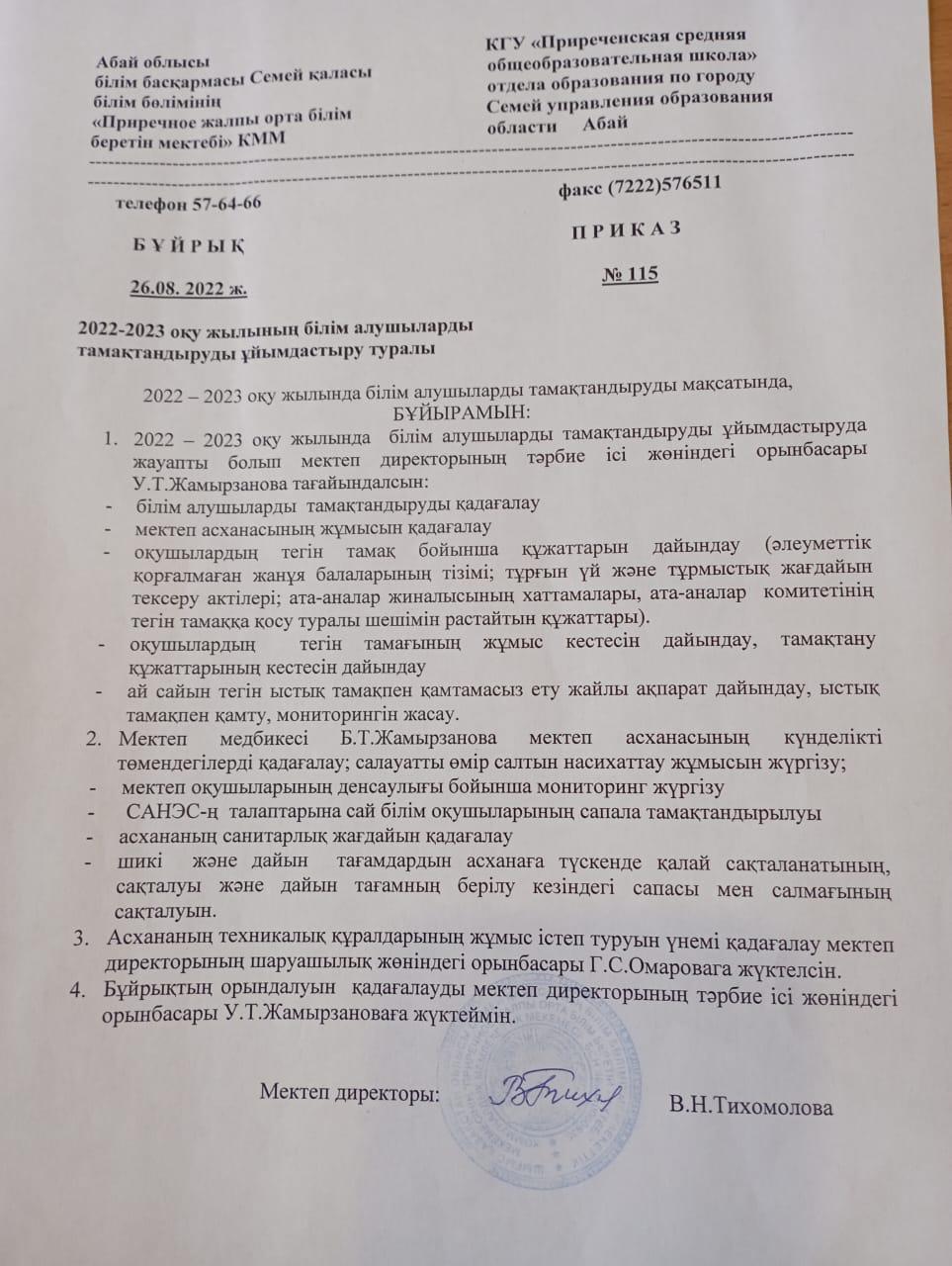 Тамақтандыруды ұйымдастыру » Приреченская средняя общеобразовательная школа